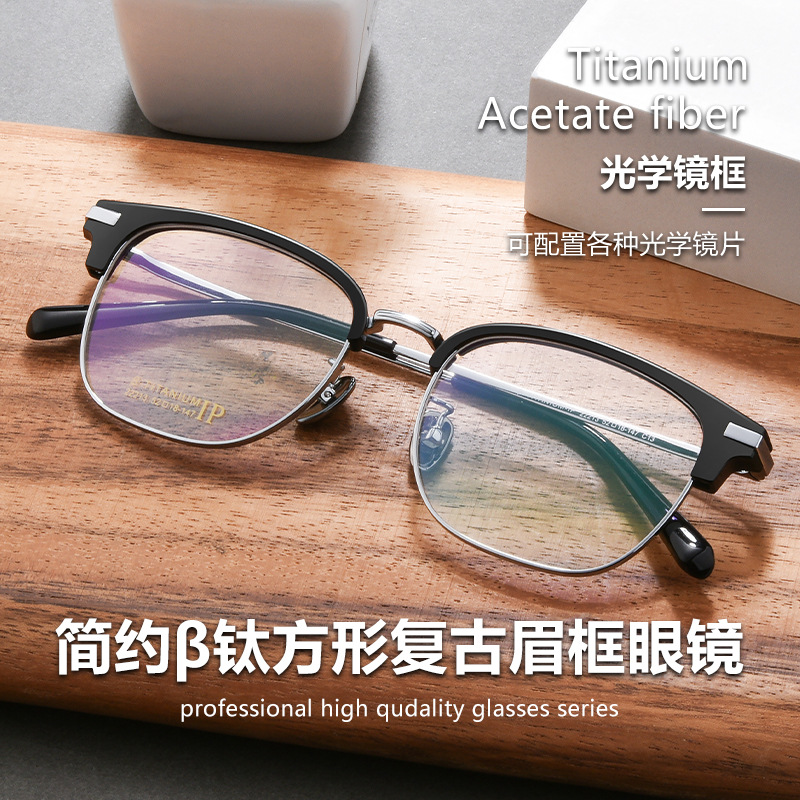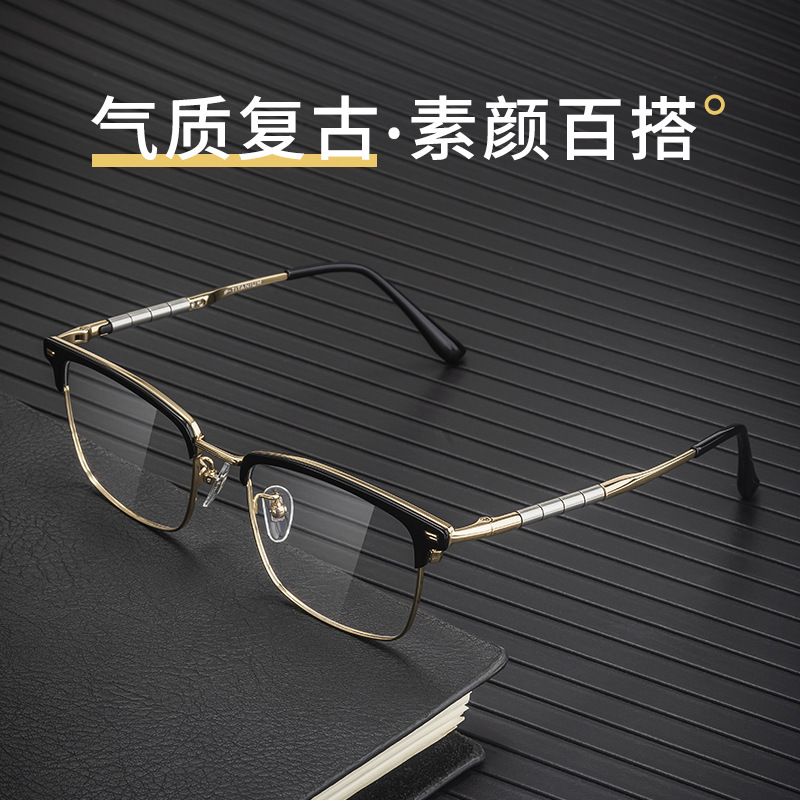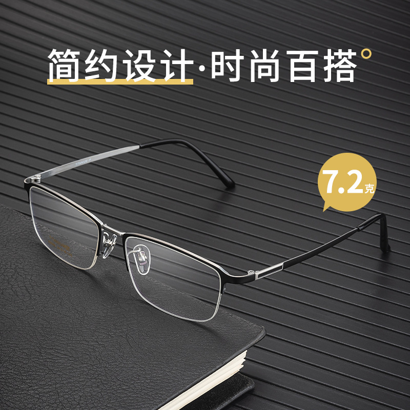 ハーフフレームメガネ男アンチブルーレイフラットライト丹陽メガネフレームミラー眉毛メガネフレーム近視メガネ純チタン8056ZM