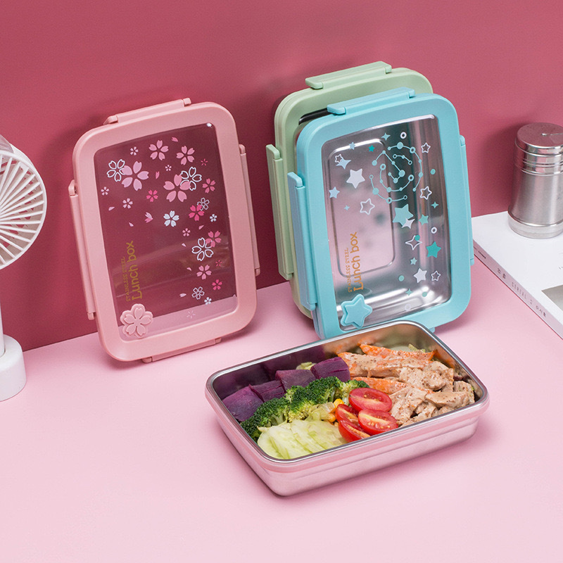長方形のステンレスの保温の弁当箱の小学生の4面は昼の弁当箱を掛けて食堂を密封します。