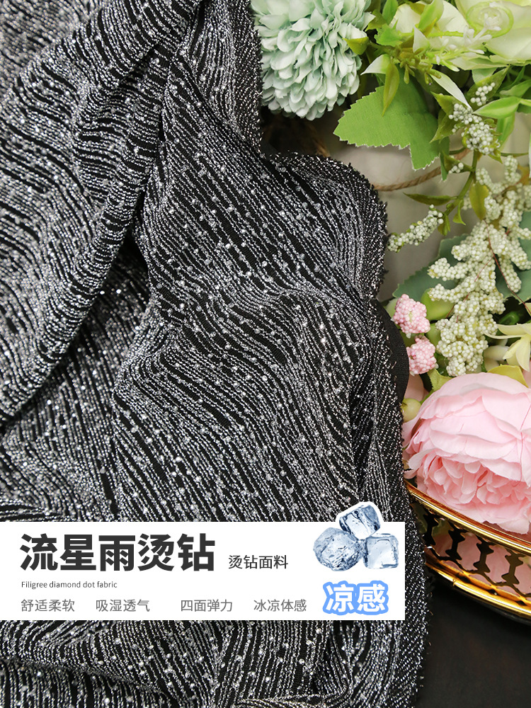 春夏のアイスシルクホットダイヤモンド生地、ファッショナブルでスタイリッシュな光沢のあるビーズと光沢のあるシルク半袖新しいボトムシャツワイドレッグパンツ生地