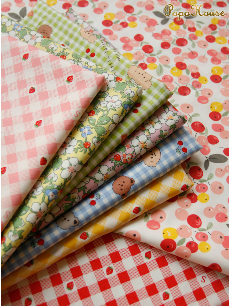 PopoHouse 春甘いイチゴ花ラブチェック柄ツイル綿生地衣類生地手作り diy