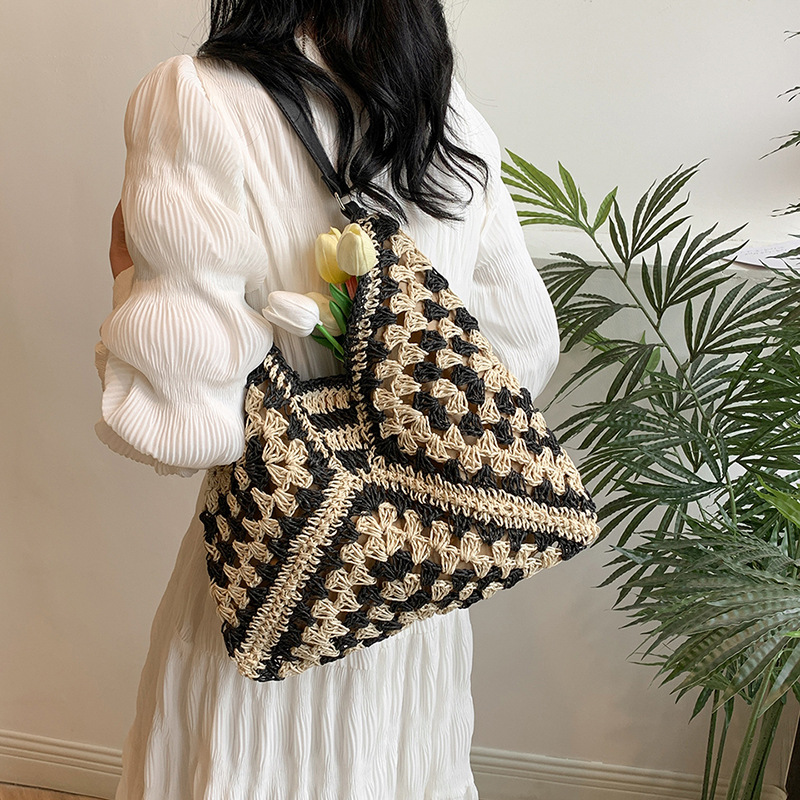 国境を越えた人気の大容量織バッグ、多用途でファッショナブルなコントラストチェック柄ストローバッグ、休暇通勤ショルダーハンドバッグ