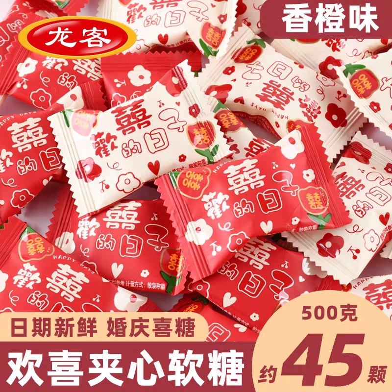 龍客歓喜爆糊サンドイッチジュースソフトキャンディ散称500gスナックキャンディーオレンジ味結婚祝い喜糖卸売り