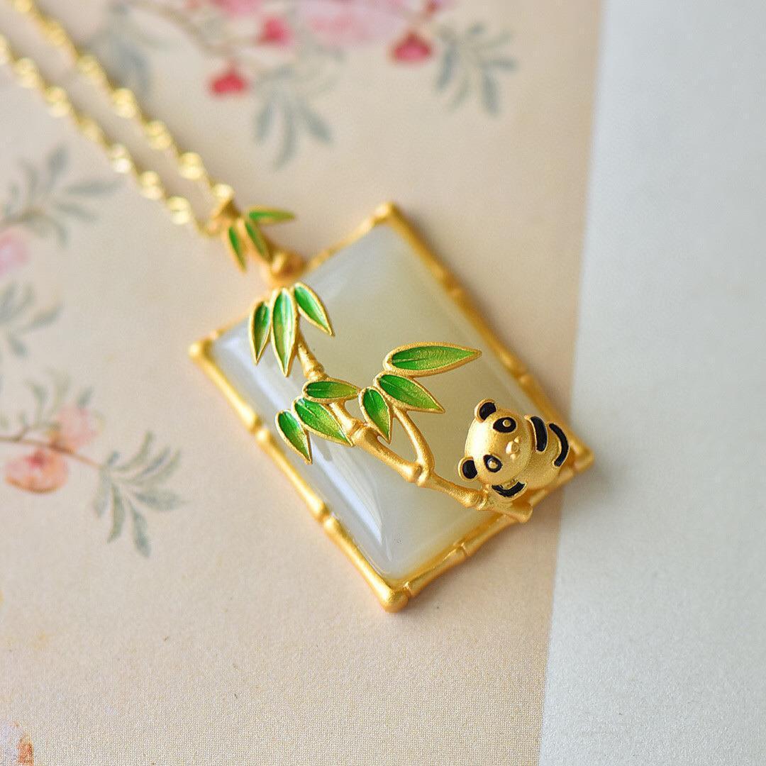 ファッション銅ジュエリー金メッキモザイク玉磁器竹の葉ネックレスパンダペンダント