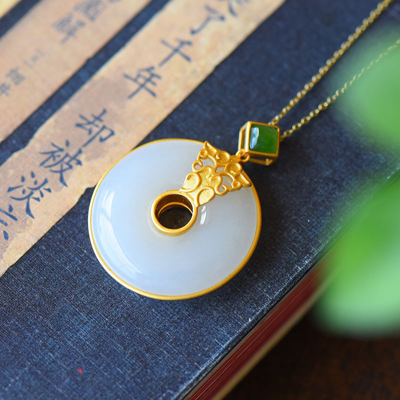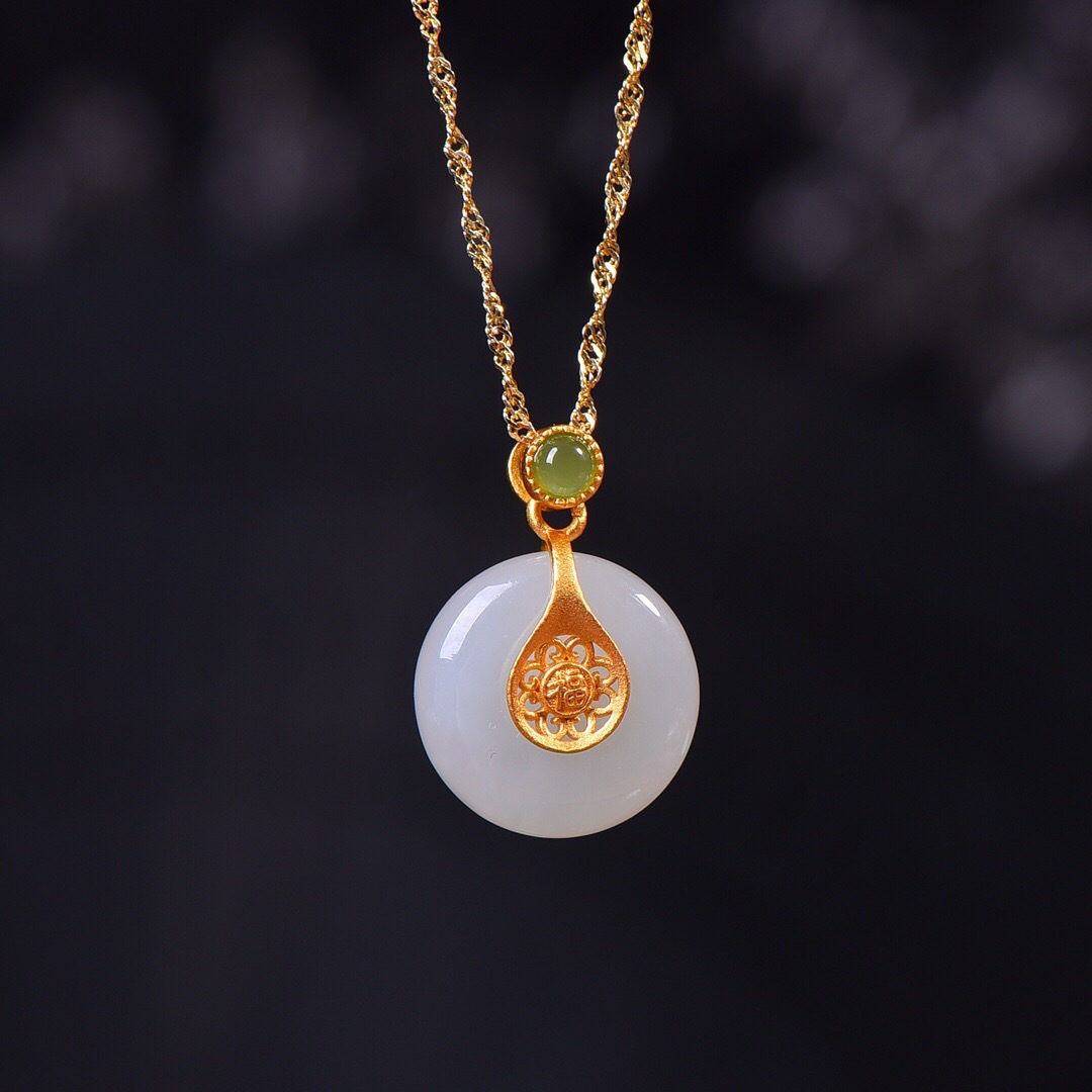 合金の金メッキの鎖骨のネックレスは平安をはめ込んで白玉のペンダントの民族風の中国式の経典の項は玉がぶら下がってぶら下がっています。