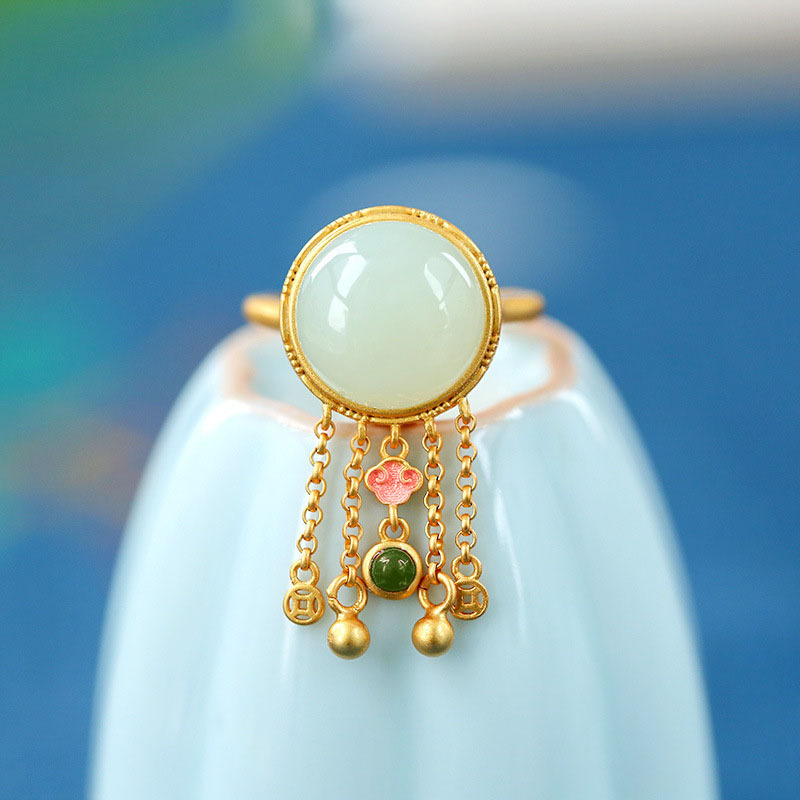 日系流蘇天然和田玉碧玉指輪女性レトロ宮廷風デザイン民族開口s925銀指輪