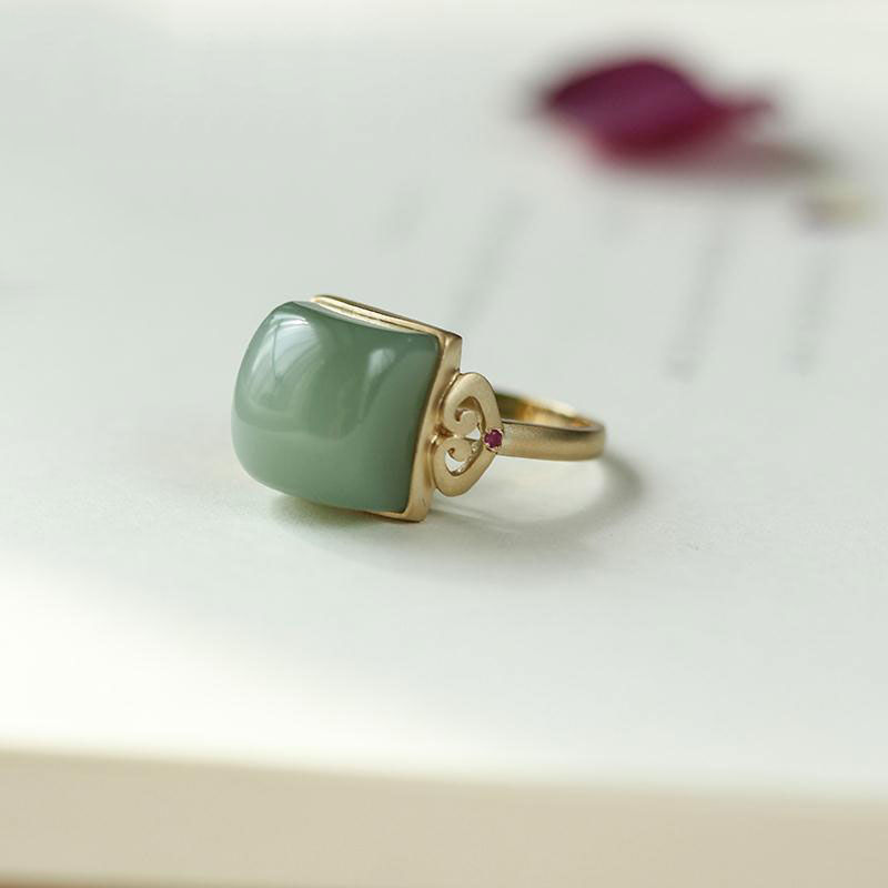 青玉天然和田玉緑玉指輪金色日系宮廷風復古開口メッキ925銀指輪女性