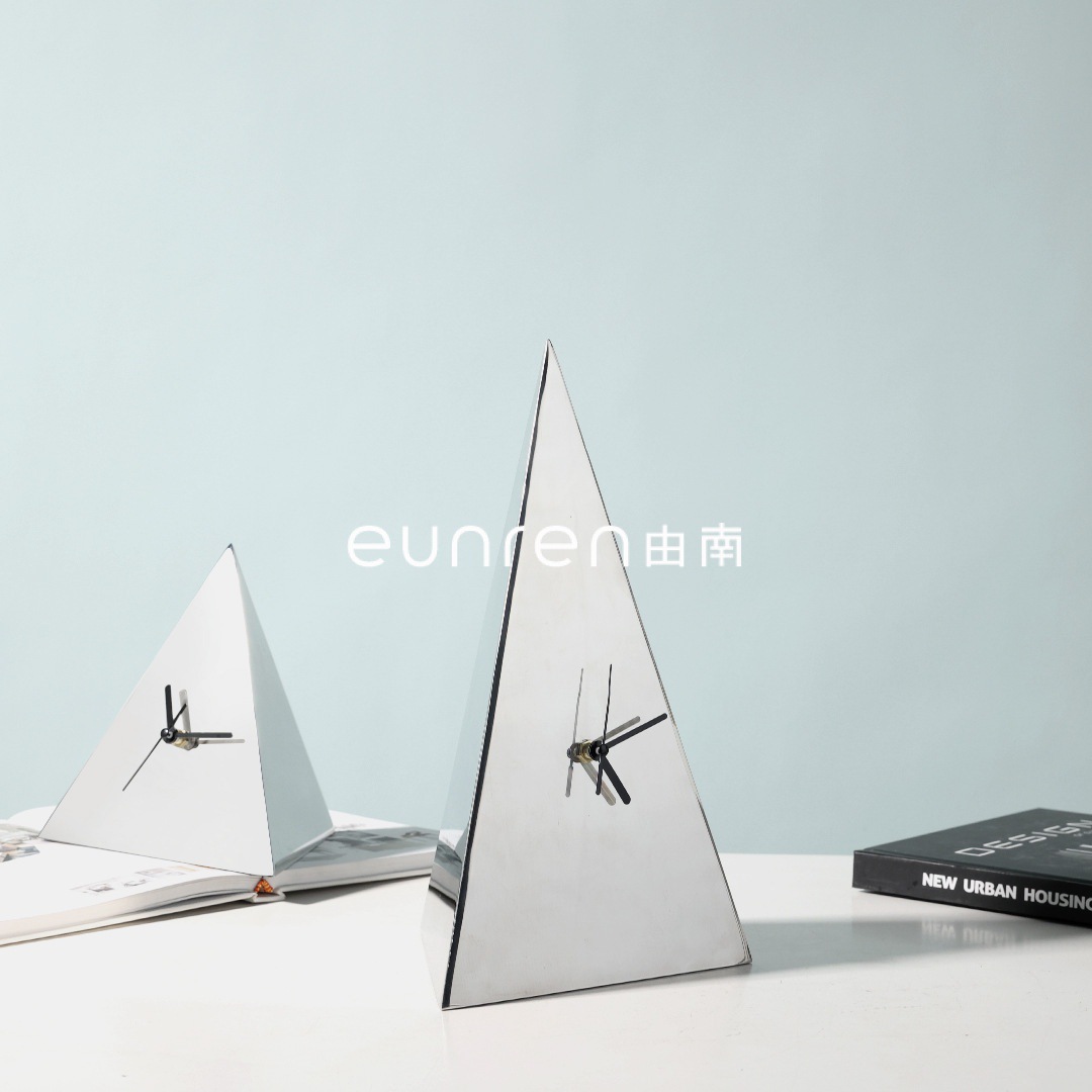 南の家の現代の軽い豪華なステンレスの鏡面のピラミッドの時計の置物の販売所の幾何学の芸術の装飾品から