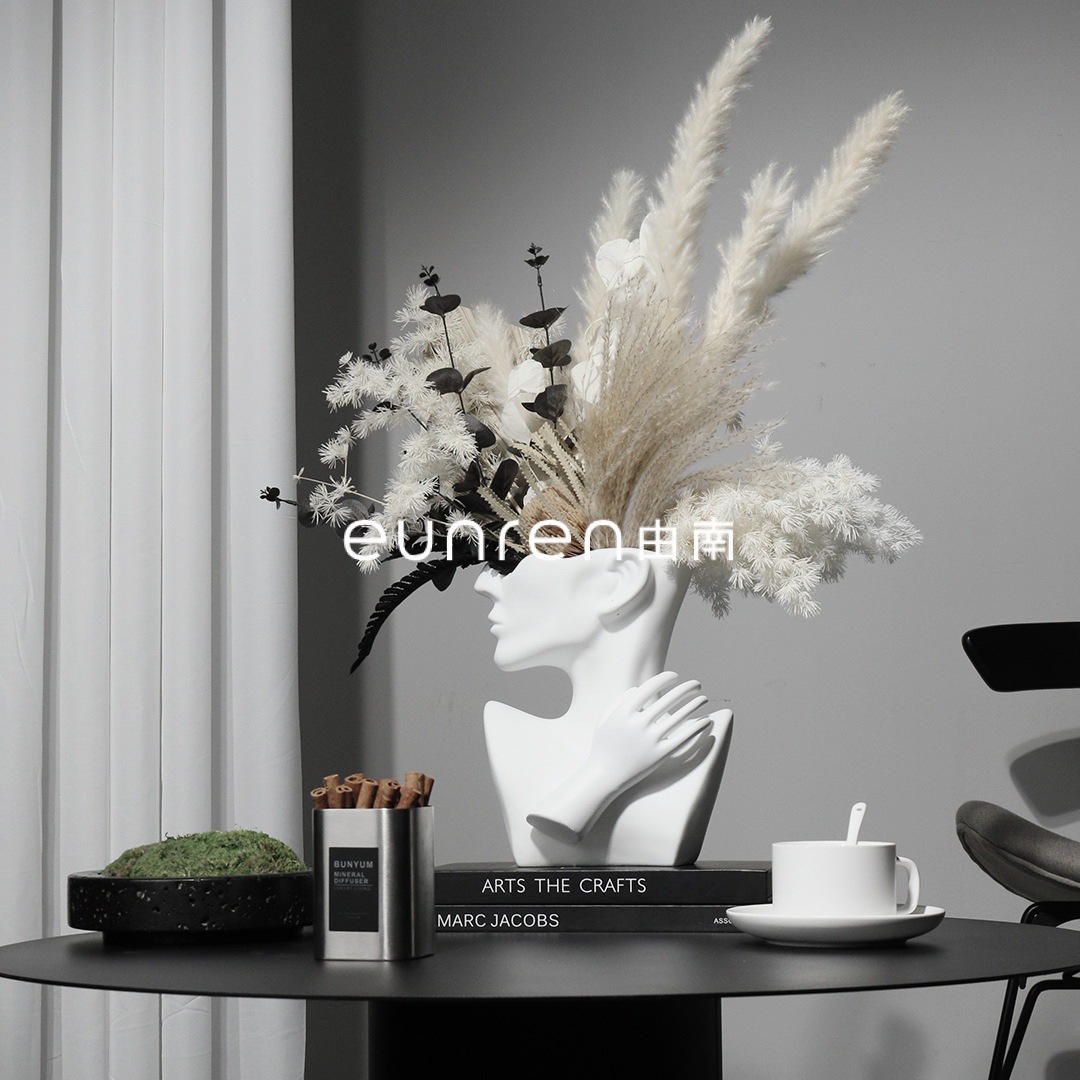 軽くて豪華な抽象的な人の頭の彫刻の置物の乾いた花の花瓶のサンプルの部屋のフードの間の宝石の展示棚
