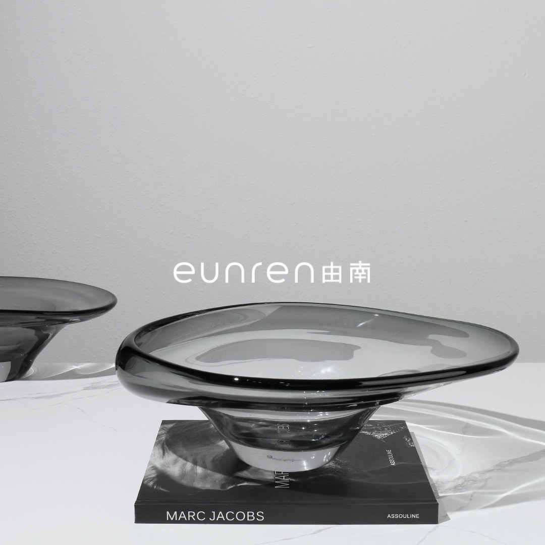 シンプルで現代的なアイデアの青いガラスの果物の皿のサンプルの部屋のテレビの棚の家庭のお茶のいくつかの収納のトレーの置物