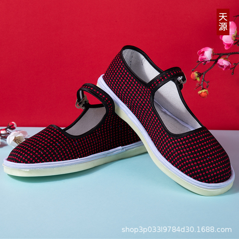 古い北京の女性の夏の縫製靴の日常の綿布の赤いバックルの現物の丸い頭は低くて織物の種類のダンスの靴を手伝います。