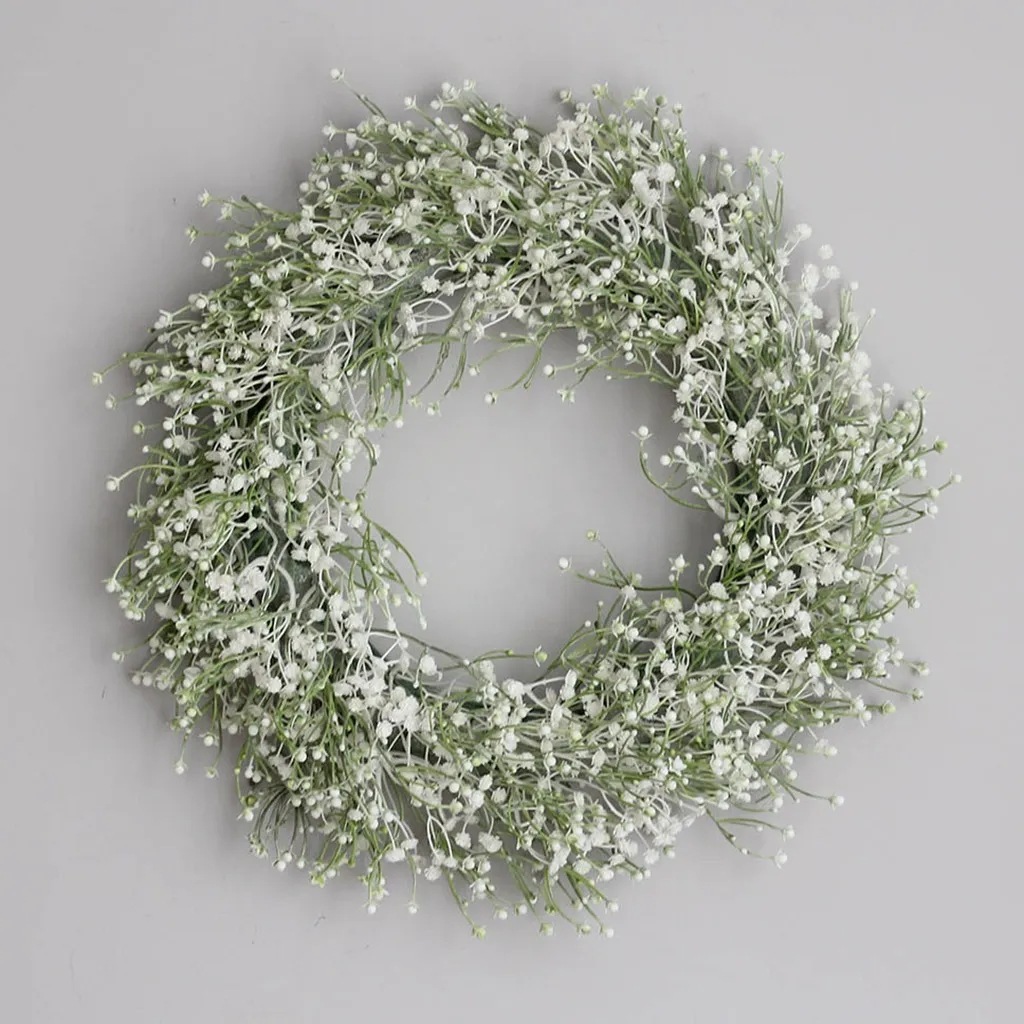 新しい国境を越えた家の祝日の白い満天の星の花輪の門の壁は白い小さな花の満天の星の花輪を飾っている
