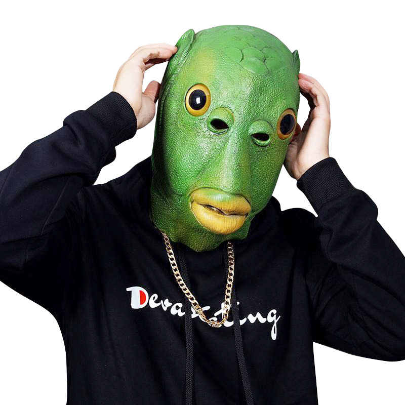 砂の彫刻の緑の頭の魚のマスクの頭のカバーの震え音はかわいい緑の魚の人のネットの赤い同項の演出の道具をいじります。