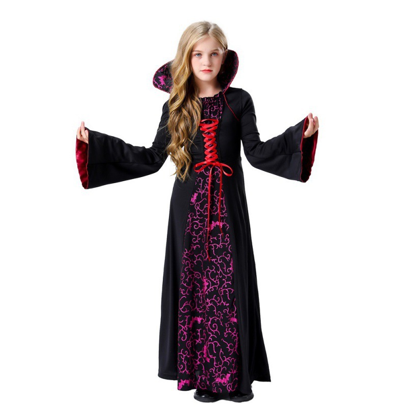 ハロウィーンの子供の吸血鬼欧米の女の子の黒紫色の魔法使いの服の中世の幅はワンピースの長袖のスカートを並べます。