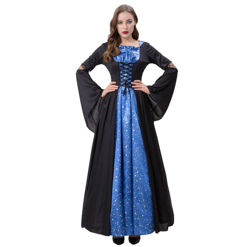 ハロウィーン衣装大人青黒星プリント魔法使い舞台演出服魔女コスプレ服