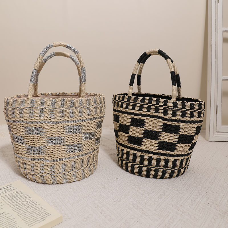 高級感のある白黒の格子のバケツの草の編み物は新型の手提げの草の包みを包んで休暇のビーチのカバンを編みます。