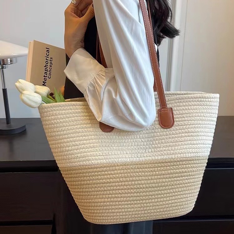 大容量綿糸編みバッグ新型フランス式レトロ手提げ草編みバッグ