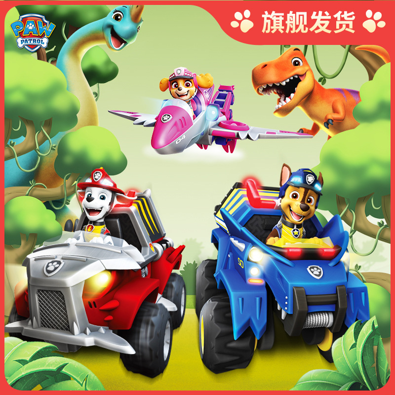 汪汪チームが大功汪汪チームのおもちゃの新商品の恐竜救助車の犬のパトカーの慣性車の救助隊を立てます。