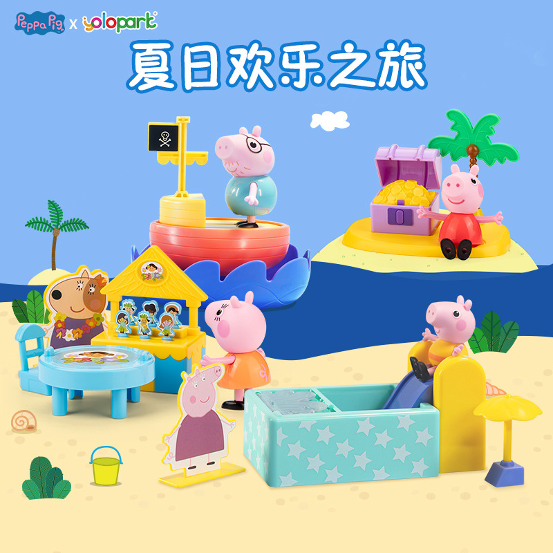 子豚のページのおもちゃの子供のままごとの夏の滑り台のジョージのぬいぐるみの海賊の船の人形は札の誕生日のプレゼントを立てます。