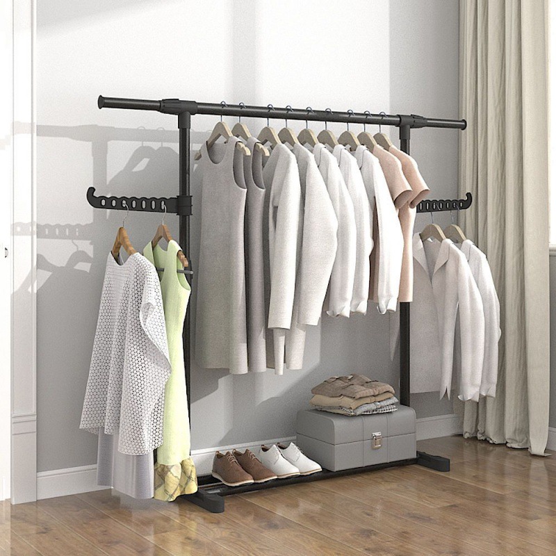 簡易服の帽子の棚の双竿式のハンガーは床に落ちて室内で移動してハンガーの家庭の寝室の服の収納棚を掛けます。
