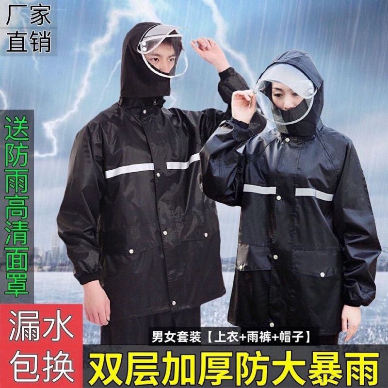 レインコート自転車のレインコートは一人で男女大人が大きく、大きなつばを厚くして自転車を共有している学生がレインコートに乗る
