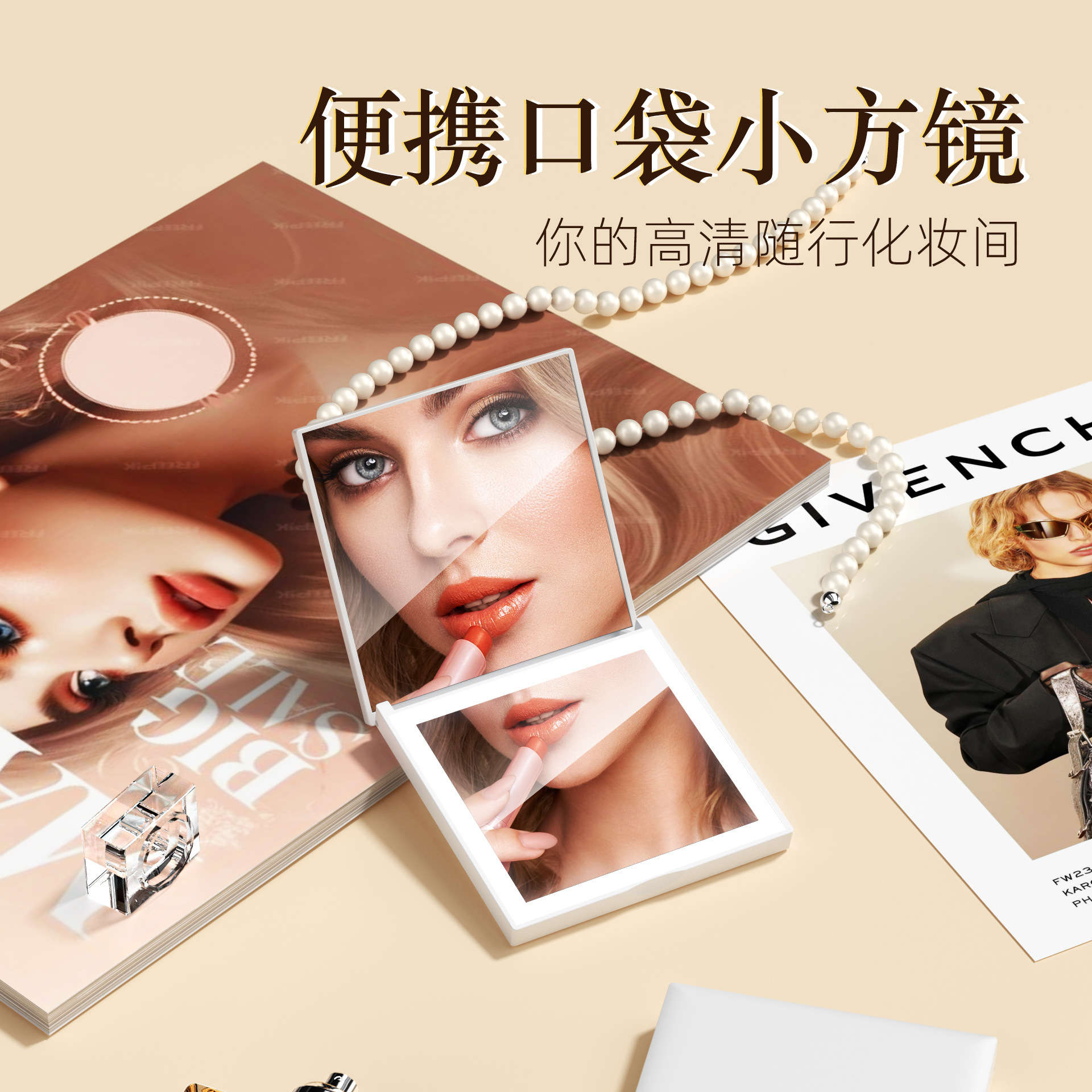 ライト付きスクエアポータブルLED化粧鏡、折りたたみ式、印刷可能なロゴ、ハンドヘルド2倍ミラー、ポータブルLED化粧鏡