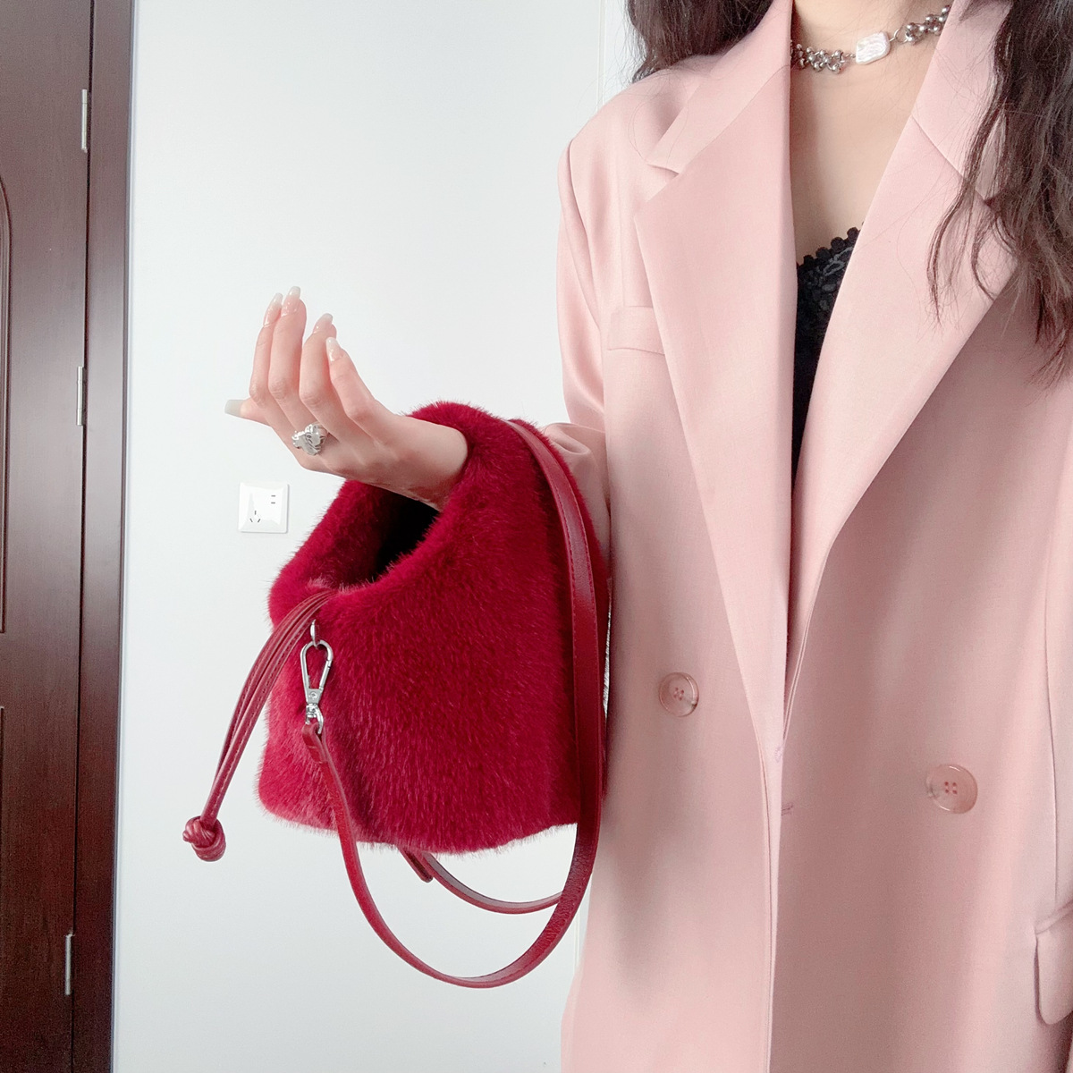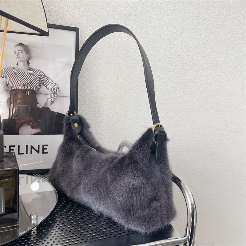 新品ミンクファー脇下バッグファー片肩斜めショルダーol風冷淡風大気ダーク系高級感レディースバッグ