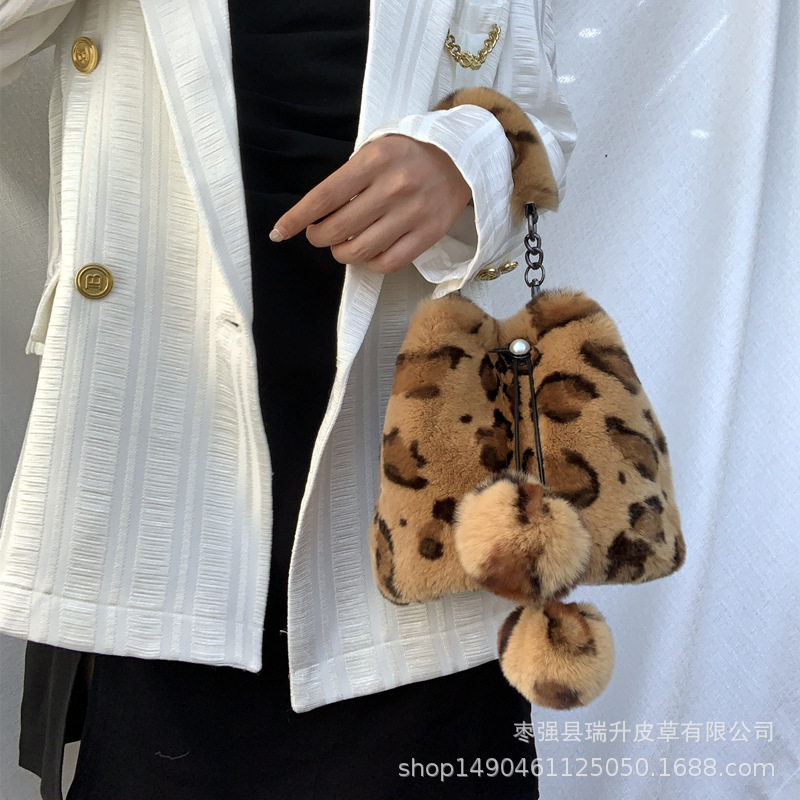 2021新しいウサギの毛の女性のバッグのハンドバッグの斜め掛けのバケツのバッグのヒョウのファッションの流行の大容量のひも