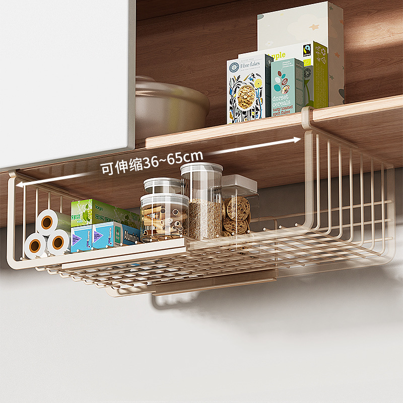 机の下の収納棚の物置棚の寮のバスケットを掛けます。
