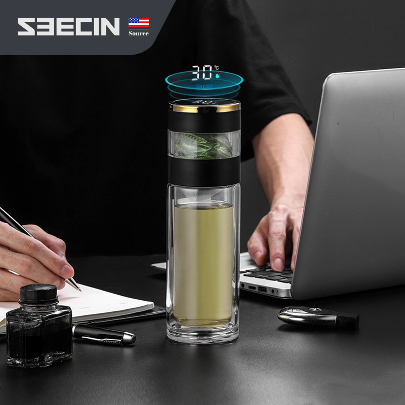 Seecinインテリジェント温度測定カップ茶水分離カップ二重厚ガラスカップ男性女性