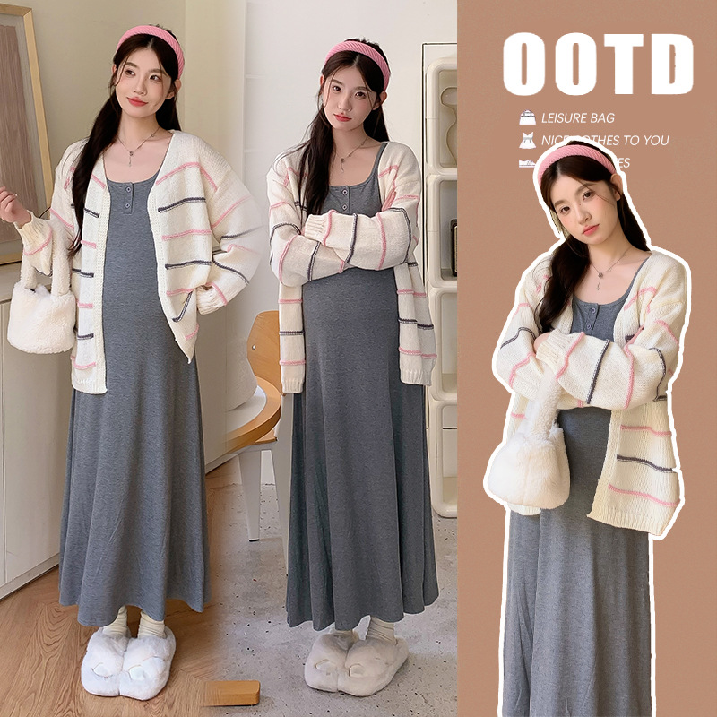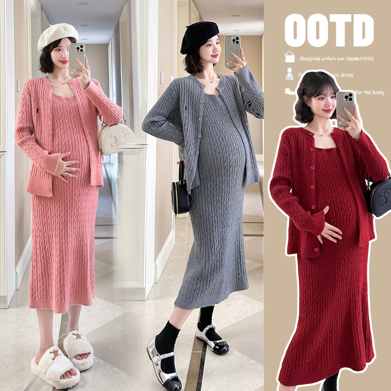 妊婦服秋冬ファッション新作ファッションママ韓国版デザイン感小香風カーディガンのストラップワンピース2点セット
