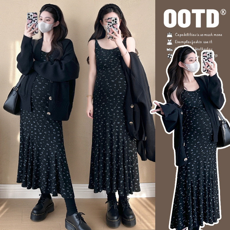 妊婦服秋冬潮母ワンピース高級感小香風ニットカーディガンベストスカート2点セットロングスカート