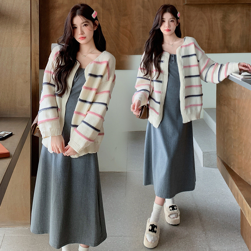 妊婦の秋の怠惰なストライプのカーディガンのサスペンダーのスカートのスーツのファッションのお母さんの秋冬の新型のゆったりしているファッションの年齢を減らします2つのセット