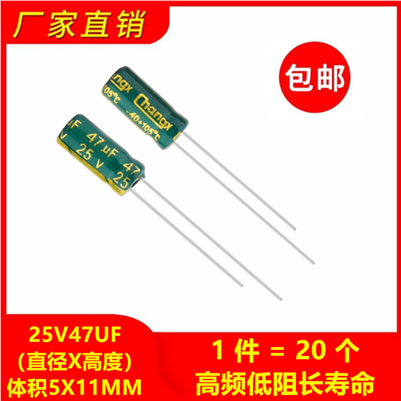 送料無料 20 個 25V47UF 高周波低抵抗長寿命高温耐性グリーンゴールド電解コンデンサボリューム 5X11MM