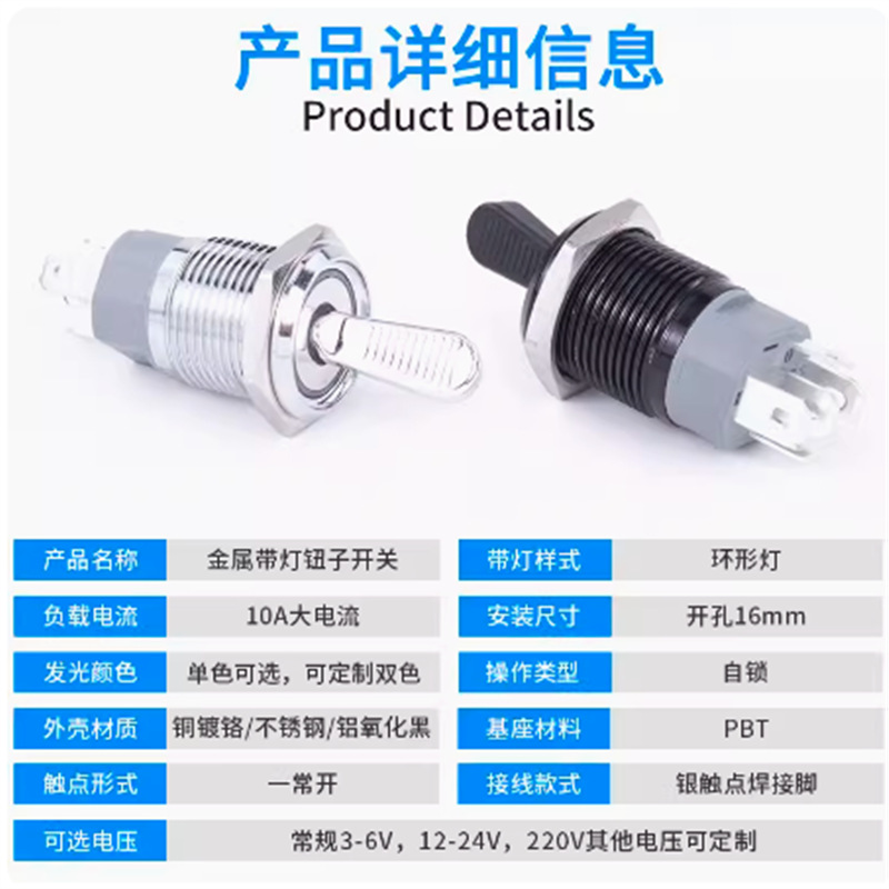 16mm金属ボタンスイッチ2シフト10a大電流ランプ付きレバー式セルフロックアームボタン