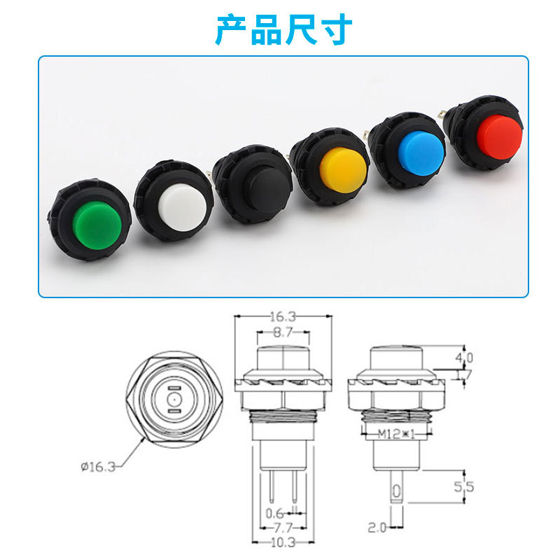 12mm円頭自己リセットロックなしDS-502ショートタイプのプラスチックボタンスイッチ常開点動スイッチ赤黄青白