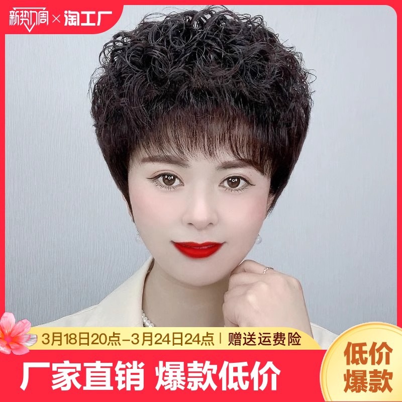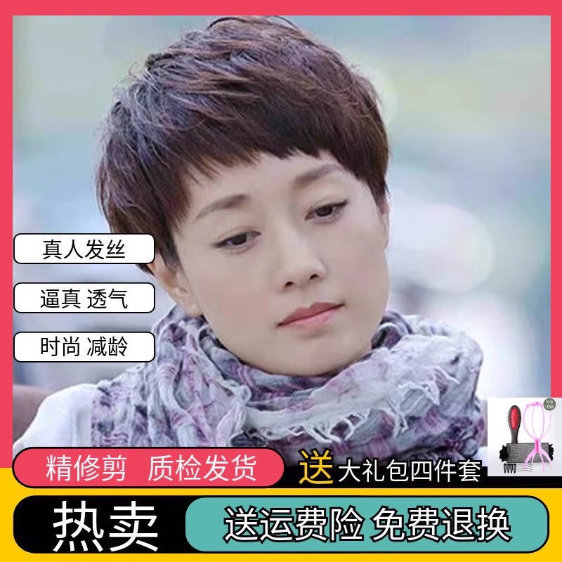 かつら真髪全真人髪かつら女短髪丸顔真髪中高年のかつら真人髪がふわふわしている