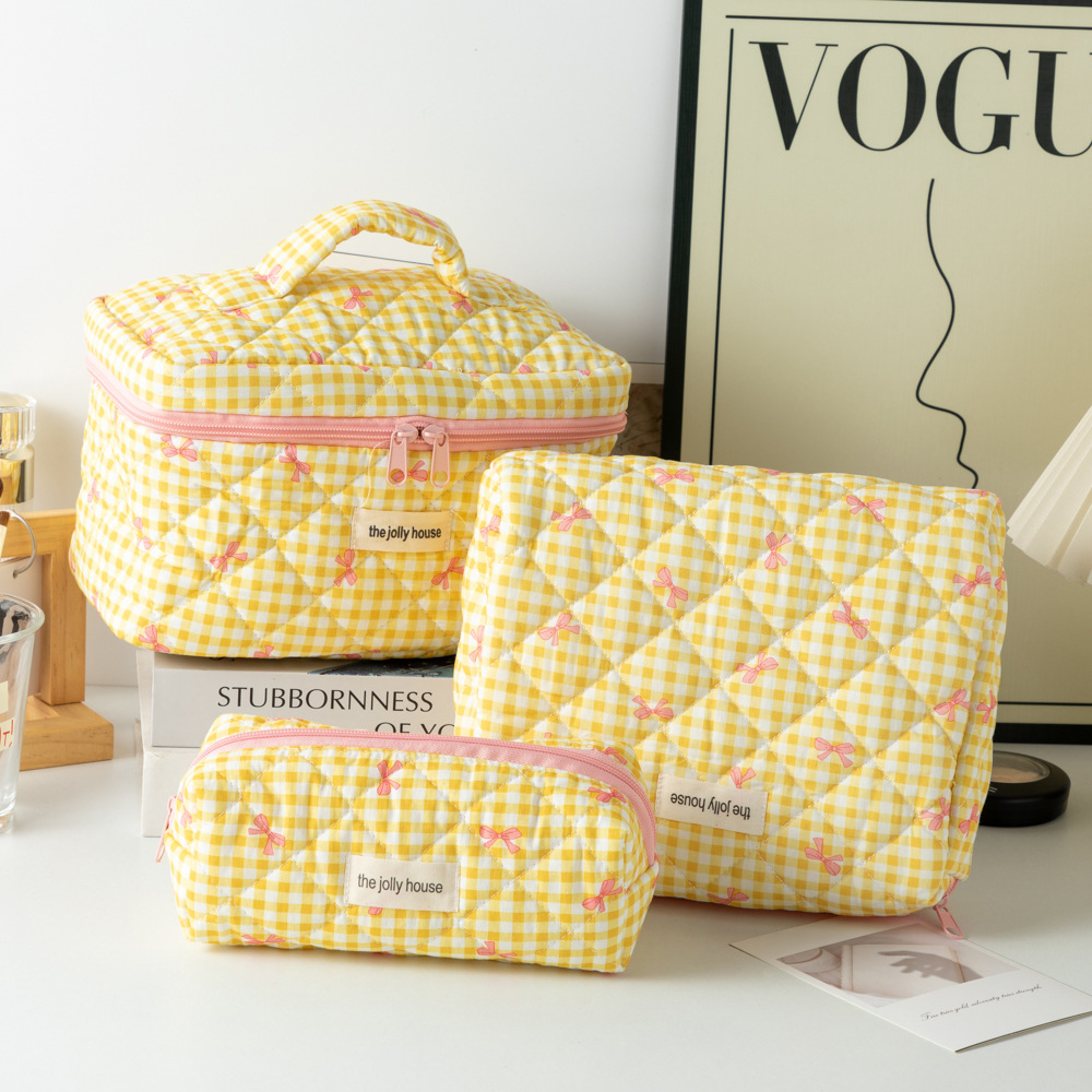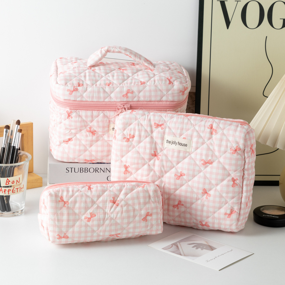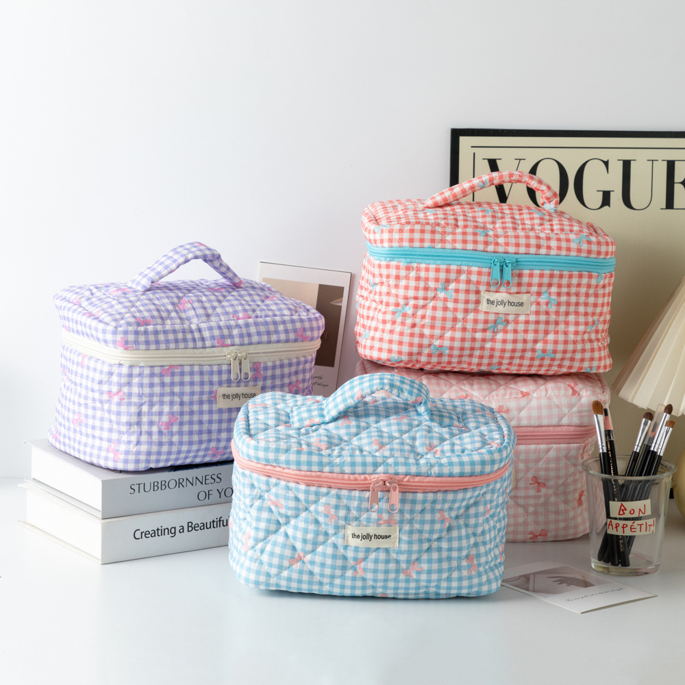 格子蝶結び化粧バッグ大容量甘美学生キルティング収納バッグ携帯用柔らかいハンドバッグ洗面バッグ
