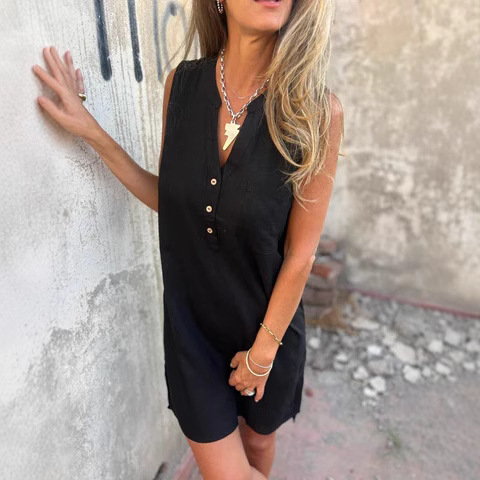 2025欧米国境を越えたアマゾン独立駅ファッションカジュアル綿麻純色ボタンポケット深vネックワンピース