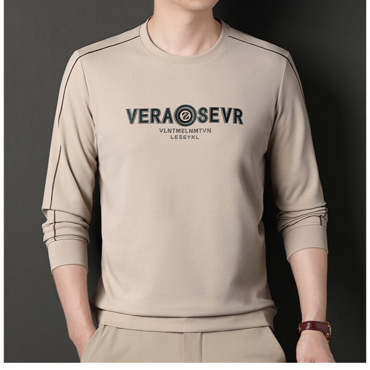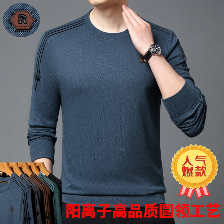 2024新型中青年男性長袖tシャツ春と秋の薄い中年のゆるい上着のお父さんの丸襟の底のシャツ