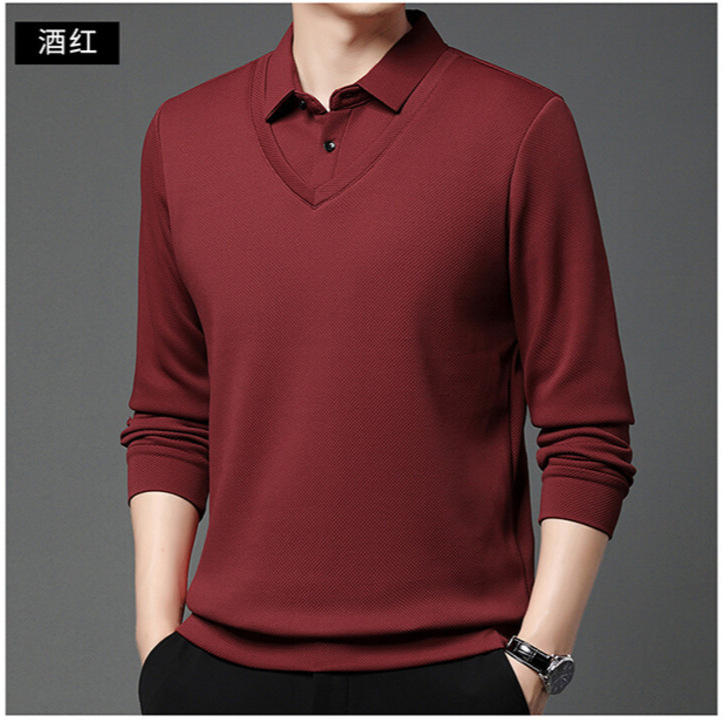 紳士服のパイナップルの格の偽の2つの純色のカジュアルな春と秋のゆったりした長袖のスリムな襟の男性のpoloシャツの上着