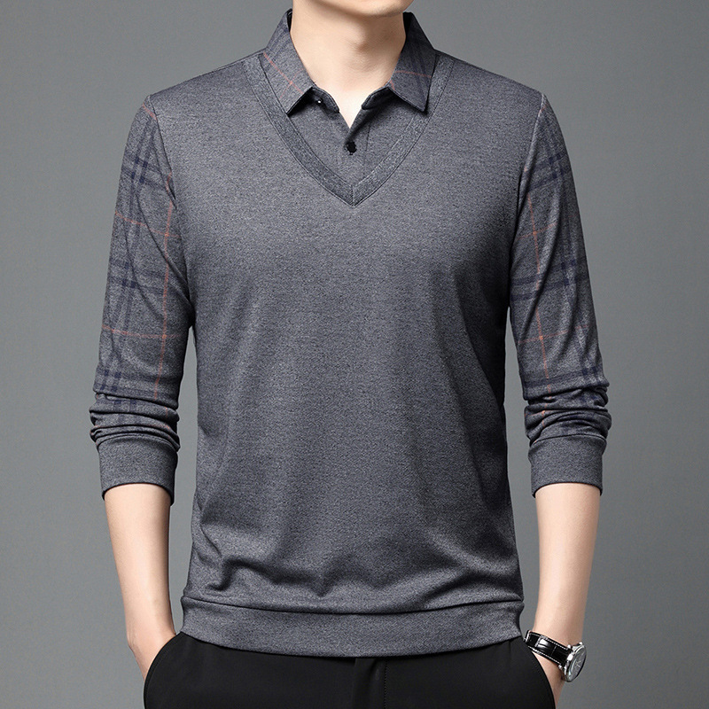 メンズ春秋新作長袖フェイクツーピースメンズラペルビジネス若者と中年者向けゆったり大きいサイズTシャツお父さん着用