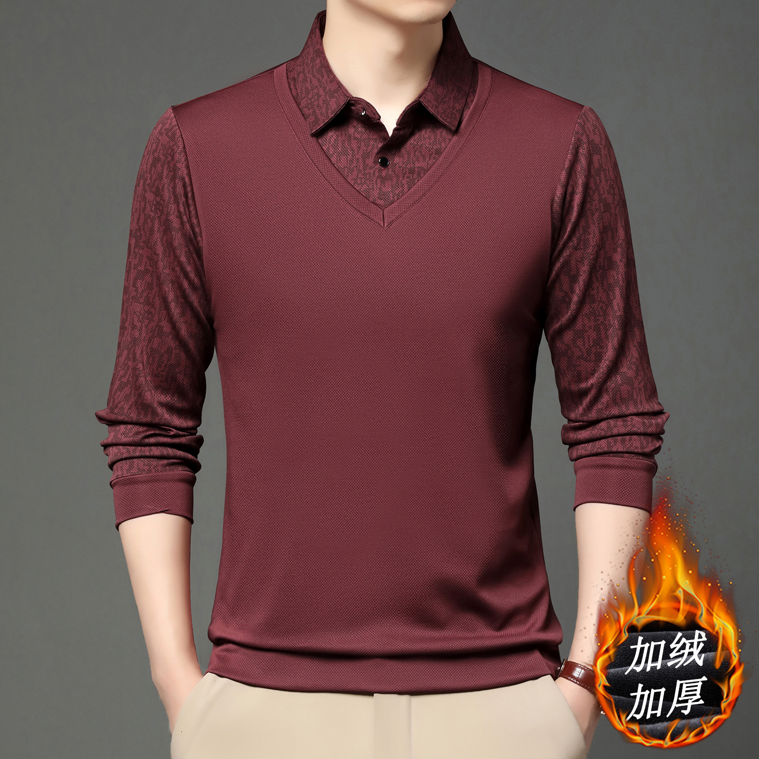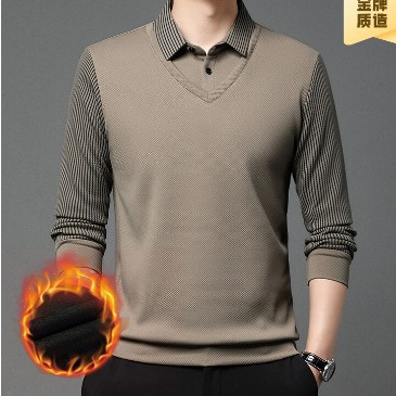 2024年男性秋冬長袖偽シャツ2枚襟tシャツ男性ベルベット厚手シャツ