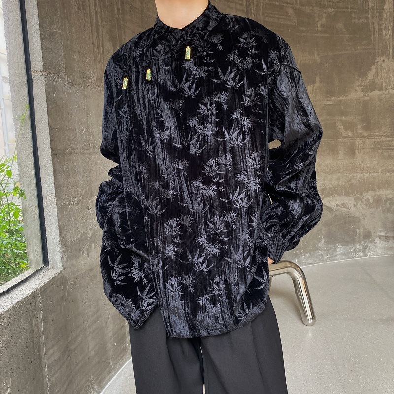 秋のベルベットのしわにエンボスされたスタンドカラーの男性と女性のシャツのレトロな禅意玉竹のペンダントシャツ26065115