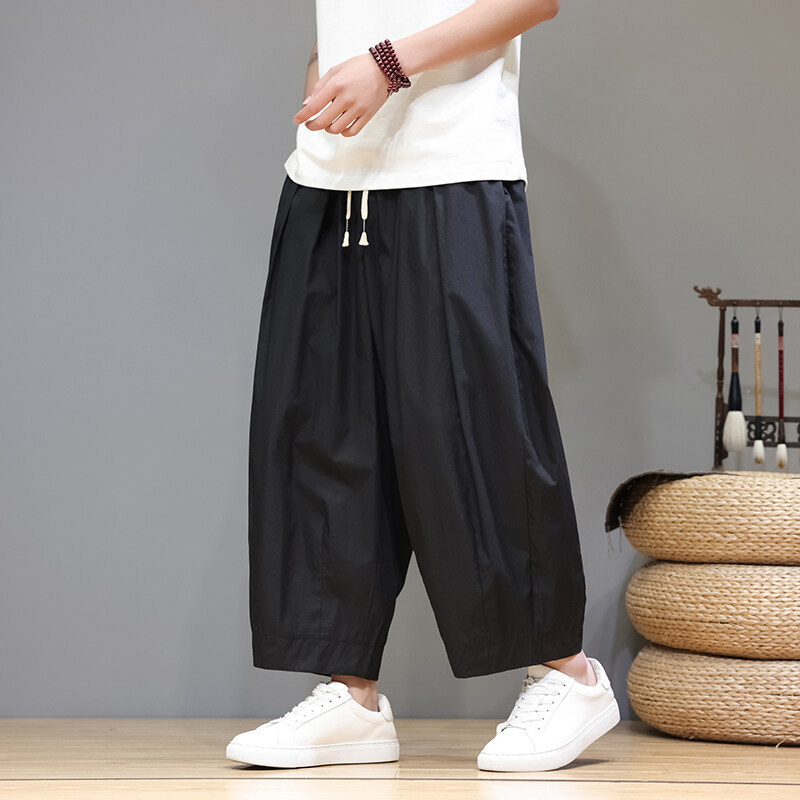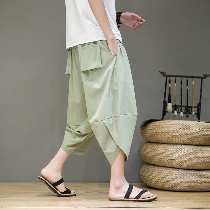 中国風のパンツメンズ夏薄いルーズアイスシルククロップドパンツメンズカジュアルファットハーレムパンツ A28-550