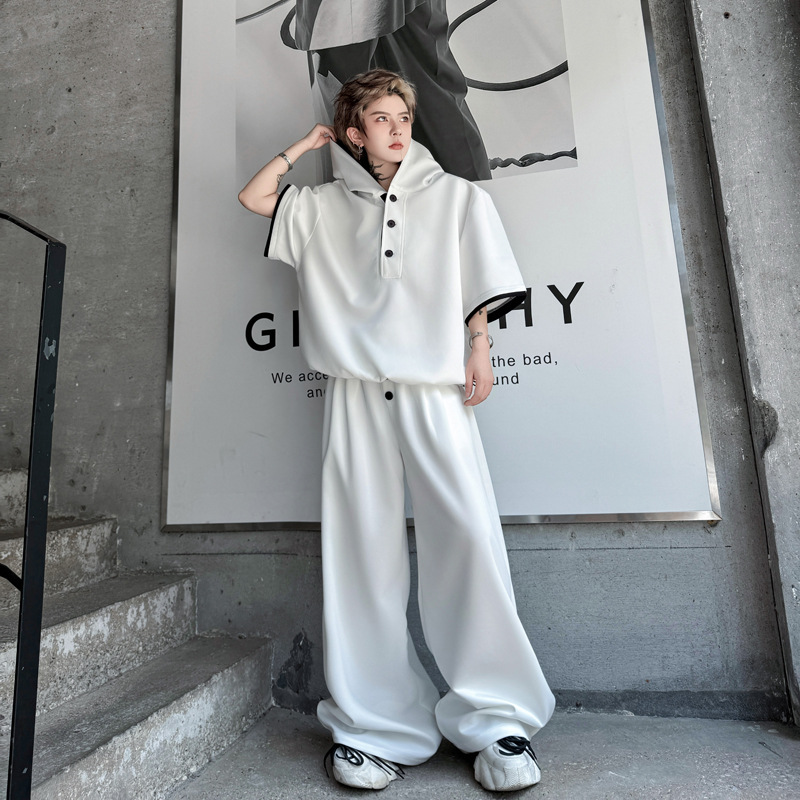 春夏黒と白のステッチコントラストカラーフード付きスーツカジュアルパンツシミターパンツトレンディで多用途 H2259 5170