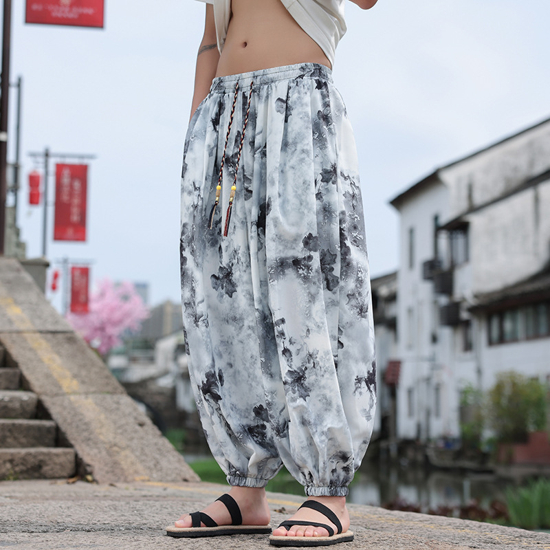中国風の夏のメンズアイスシルクパンツ、ゆったりとした薄い花柄パンツ、カジュアルな大きいサイズのハーレムパンツ、トレンディなA17-550