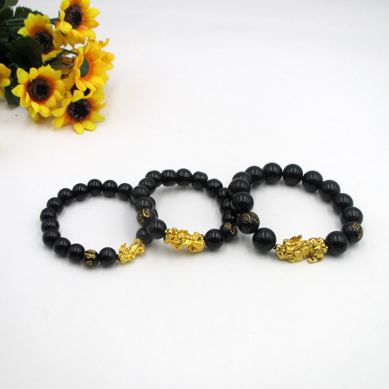 ピシュピスト保色六字真言黒珠ブレスレット10 12 14mm玉男女手珠チェーン