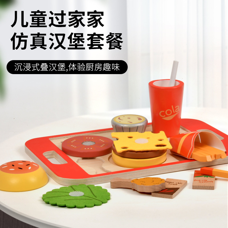 木製シミュレーションファーストフードおもちゃセット子供の早期教育ハンバーガーフライドポテトドリンクロールプレイキッチンモデルクロスボーダー