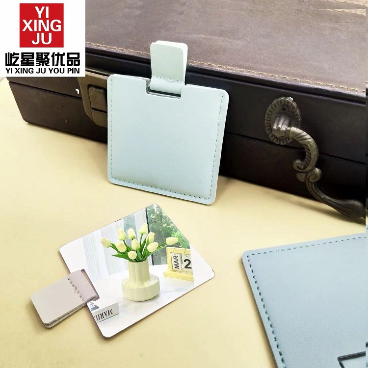 ステンレス金属美容鏡携帯pu皮革圧印転倒防止化粧鏡は小さな鏡を持ってロゴを決めることができる