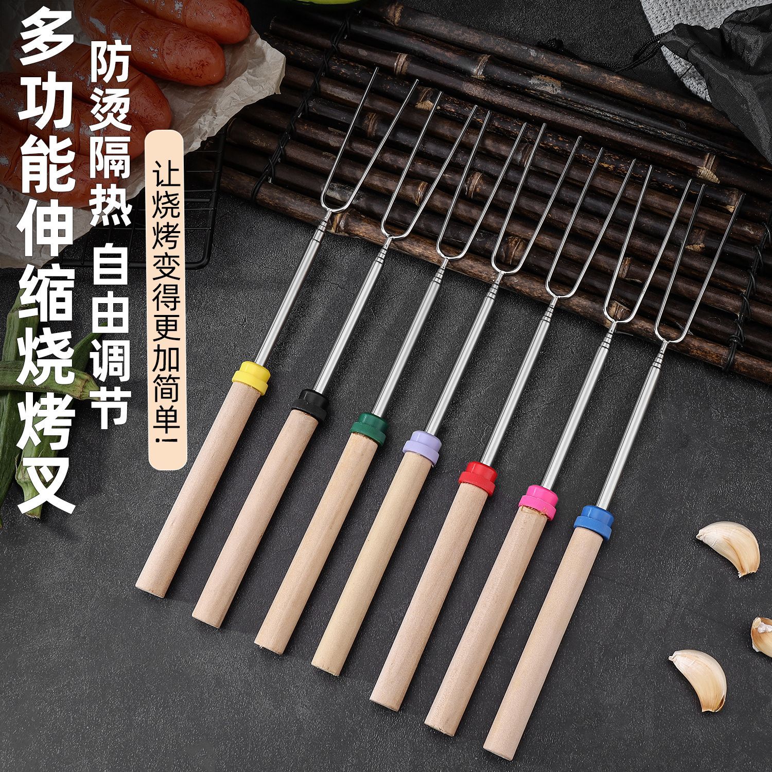 アウトドア伸縮バーベキューフォークステンレスu字フォークバーベキューツールアウトドアバーベキューセット木柄バーベキューバーフォーク